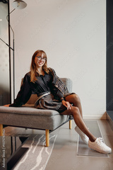 A trendy young woman relaxes on a stylish grey sofa, embodying modern fashion in a contemporary interior
