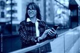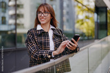 A stylish woman wearing trendy glasses actively engages with her smartphone in a vibrant and busy urban setting