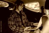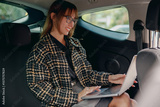 A woman dressed in a stylish jacket diligently works on her laptop, maximizing her high productivity while commuting