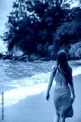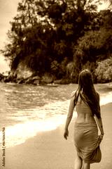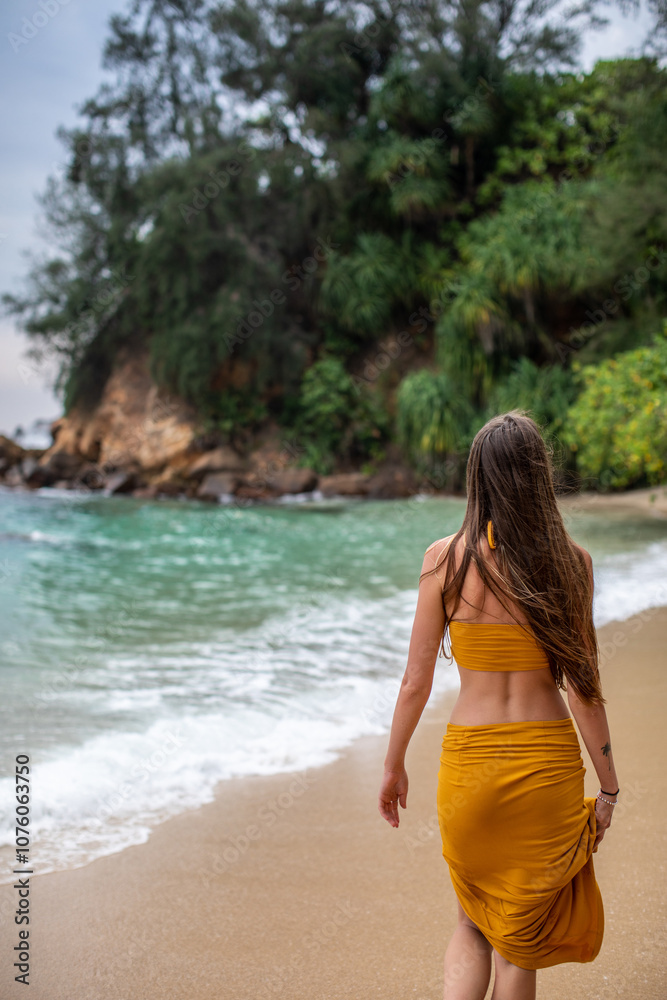 Enjoy a Serene Beach Walk A Woman in a Beautiful Yellow Dress Strolling by the Ocean Shore