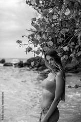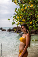 Enjoy a Serene Beach Walk A Woman in a Beautiful Yellow Dress Strolling by the Ocean Shore