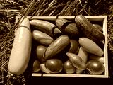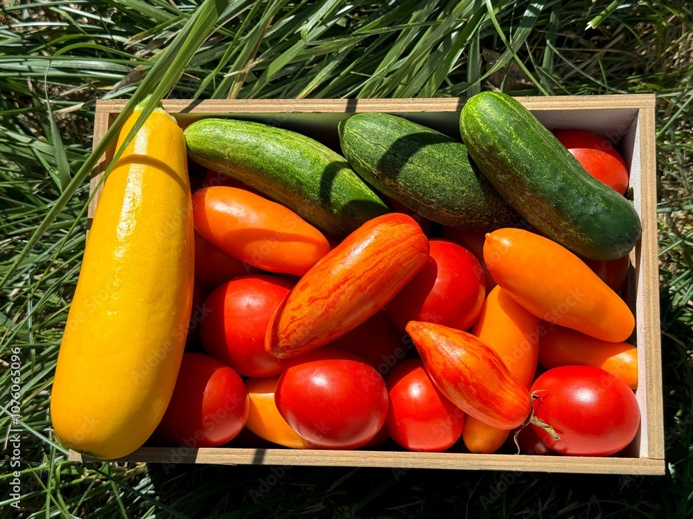 Homegrown tomatoes cucumbers zucchini vegetables.