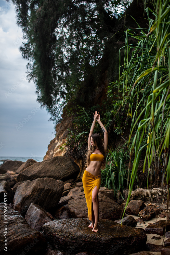 An Elegant Model Gracefully Posing Amid Nature by the Beautiful and Peaceful Shoreline