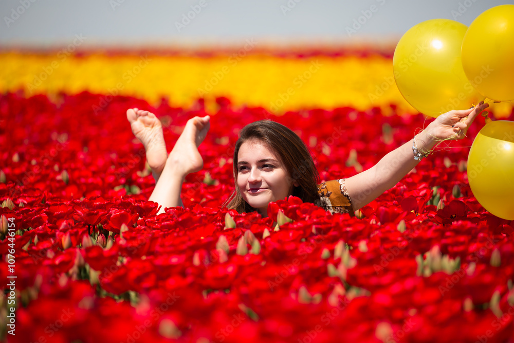 Beautiful young girl lying in a field among tulip flowers with balloons of various colors in her hand