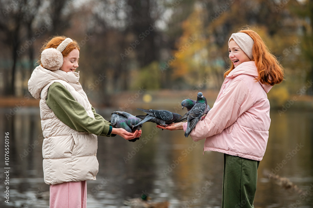 Two happy red-haired girls hand-feed pigeons during a walk in an autumn city park.
