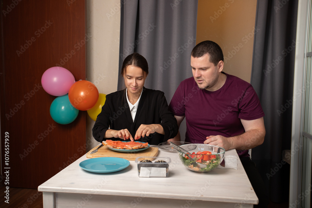 Family dinner, father and daughter preparing food for the holiday, parent and teen enjoying culinary traditions