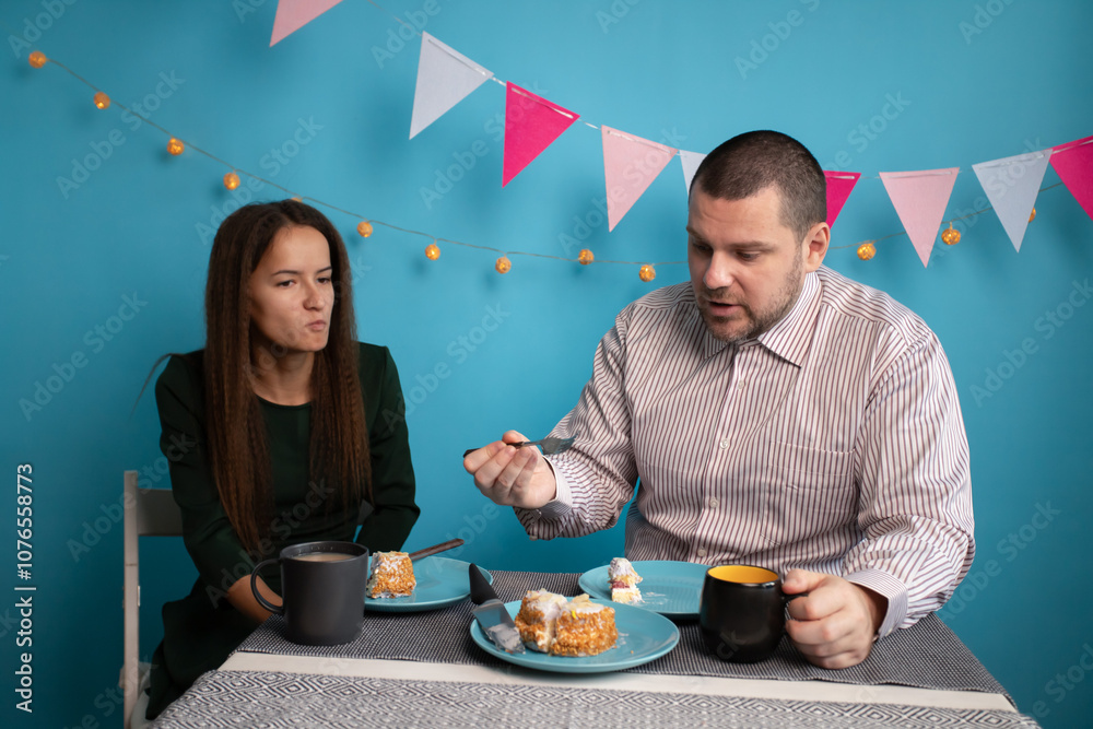 family celebration, father and daughter eating birthday cake, celebrating anniversary with family