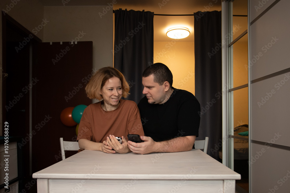 Couple looking at phone, female and male typing on smart device, watching media indoors
