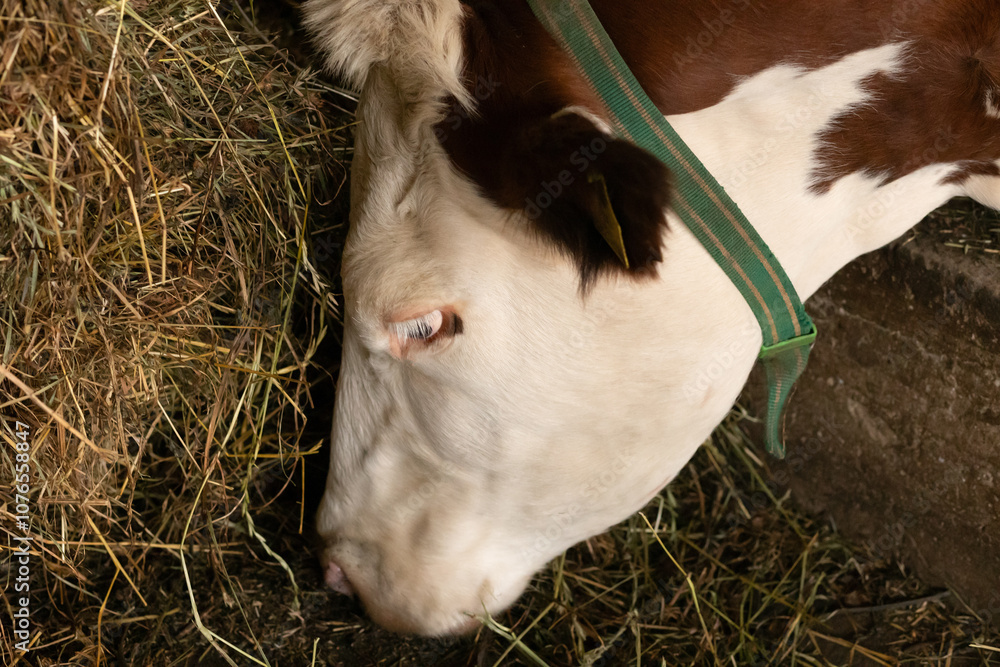 Cow's muzzle Close-up, dairy cow on ranch, bovine feeding in pasture