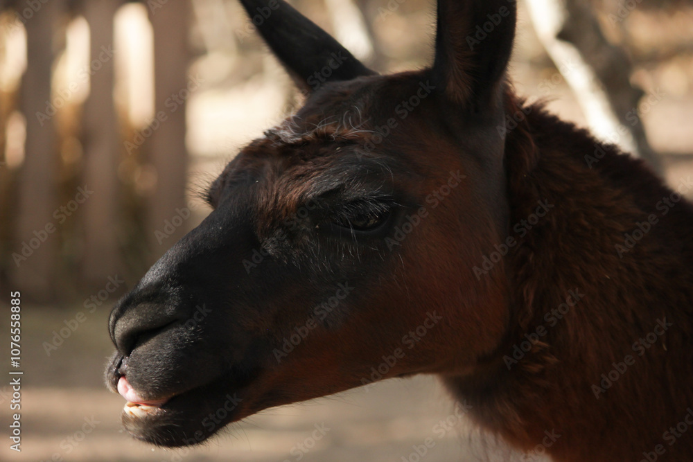 llama head close up, wool livestock chewing straw, animal standing outdoors