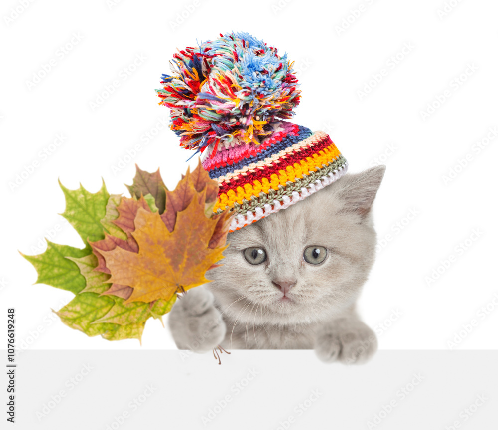 Funny kitten wearing a warm hat with pompon holding dry colorful leaves above blank white banner. isolated on white background