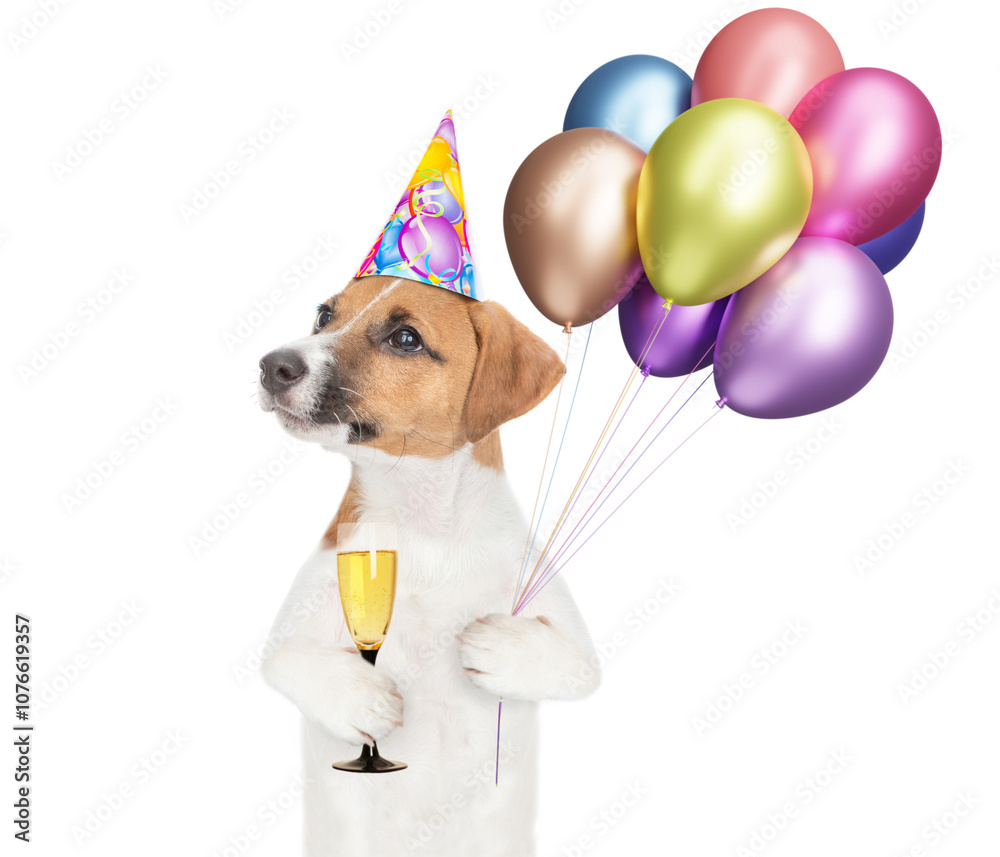 Funny jack russell terrier puppy wearing party cap holds balloons and glass of champagne. isolated on white background
