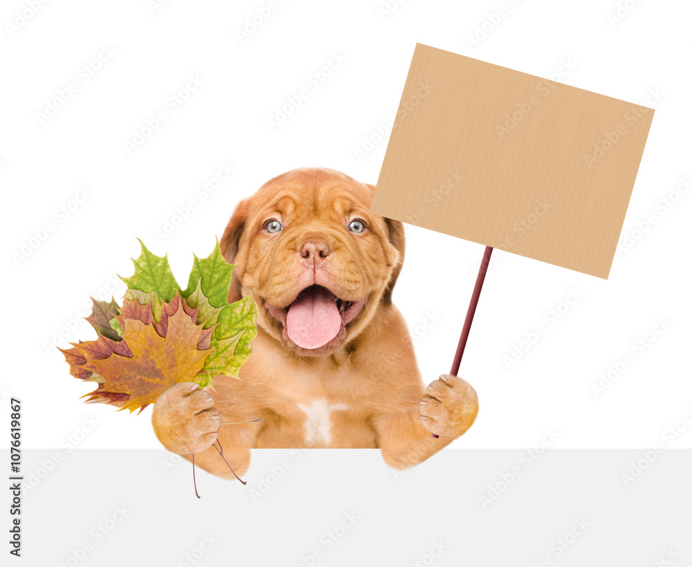 Happy Mastiff puppy holds dry colorful leaves, looks above blank white banner and shows blank placard. isolated on white background