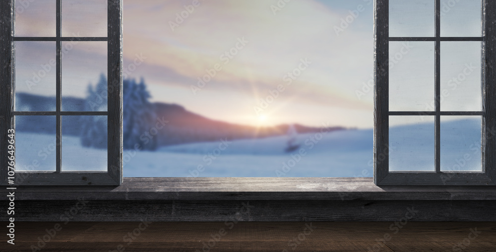 Window with panoramic view on a wintry landscape