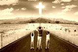 Father follow a cross sign on the road