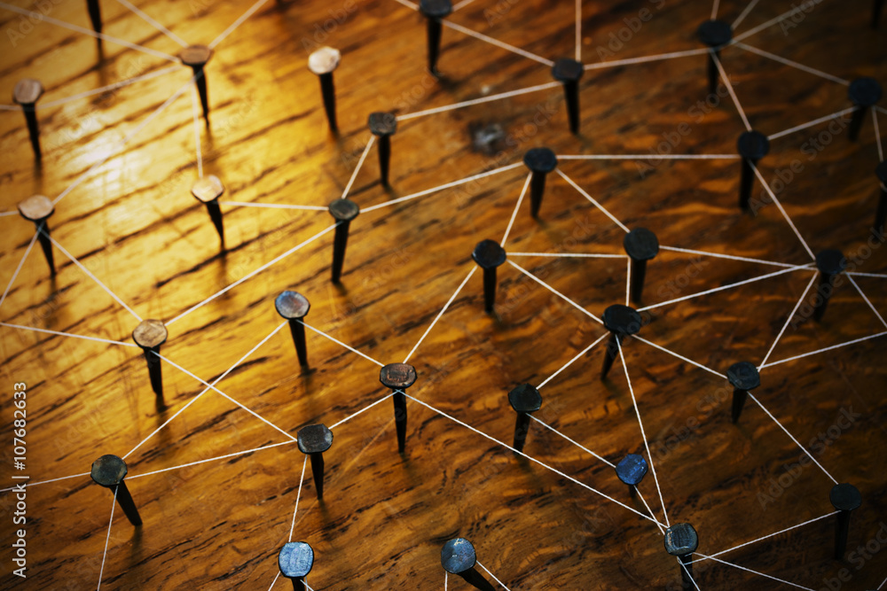 Rustic nails in wood linked by cotton
