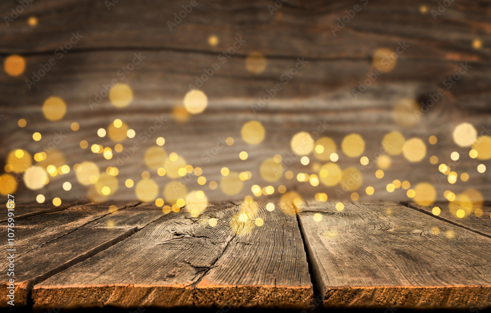 Empty rustic wooden table with defocused Christmas lights at background. Festive background with light spots and bokeh in front of a empty wooden table. copy space