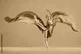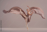 Young ballerina girl in pointe shoes dancing with developing beige fabric on uniform background