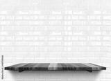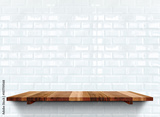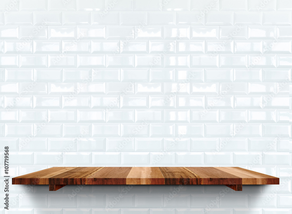 Empty wooden shelfs on white glossy tile wall, Mock up template