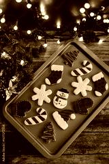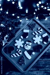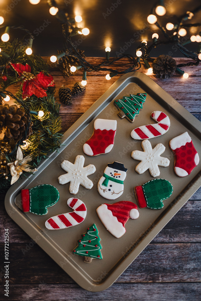 Christmas cookies on sheet or plate with golden lights on rustic table. Baking traditional snowman, tree, star cookies and santa hat