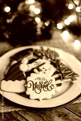 Christmas cookies on sheet or plate with golden lights on rustic table. Baking traditional snowman, tree, star cookies and santa hat