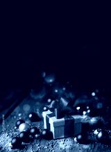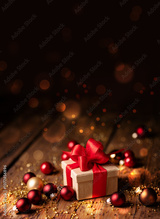 Abstract Christmas Background - Gift box with red bow and baubles on wood - Magic dark golden bokeh lights background - Ideal for Christmas greeting card on social media
