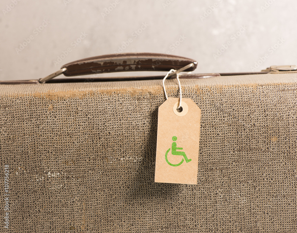 Tag with handicap symbol on old vintage suitcase. Concept of travel with luggage, tourism and holiday destination.