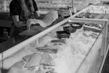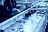 A vibrant and diverse assortment of fresh fish and seafood displayed on ice at a bustling local market