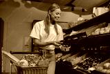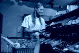 A young woman delights in choosing fresh produce while strolling through a lively and colorful market ambiance