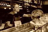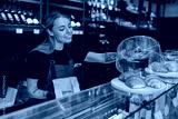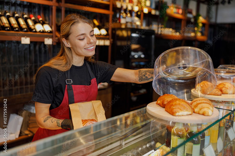 In a friendly and vibrant cafe atmosphere, a cheerful barista offers an assortment of fresh pastries daily