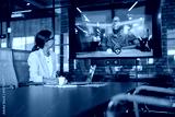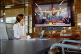 A video call taking place in a contemporary workspace that highlights collaboration and the use of advanced technology