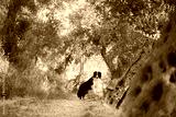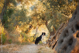 A Border Collie walks along a forest path, taking in the sights and sounds of nature.