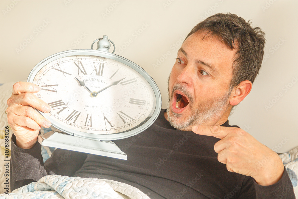 Stressed mature man pointing at alarm clock in bed, time to get up