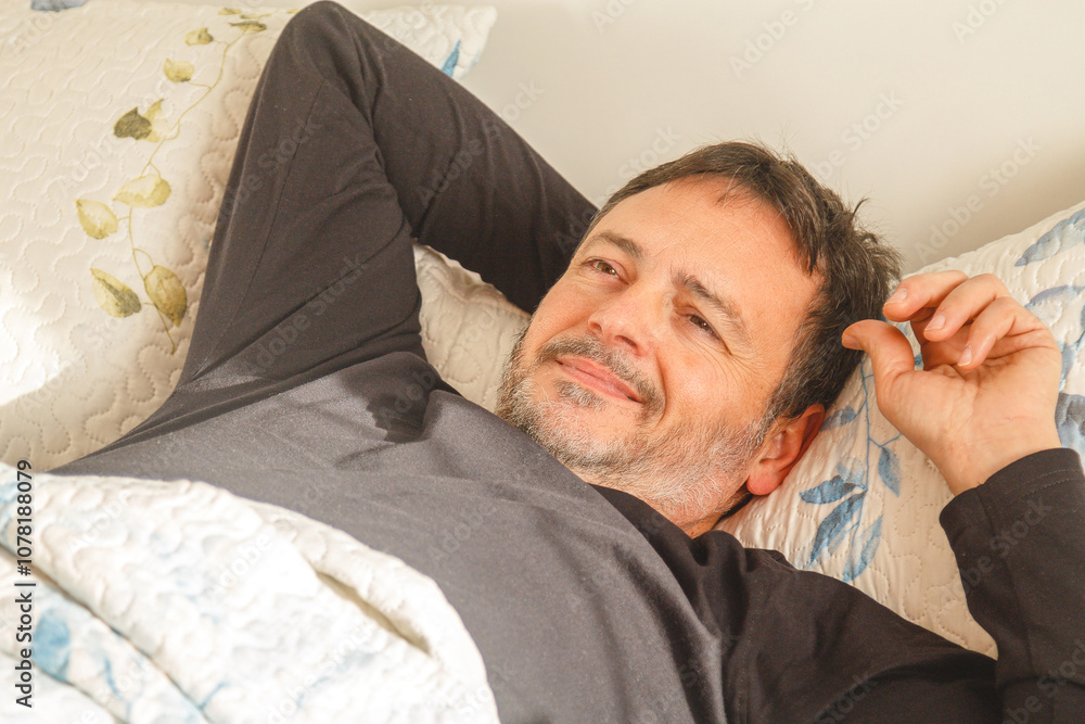 Happy middle aged man stretching in bed in the morning