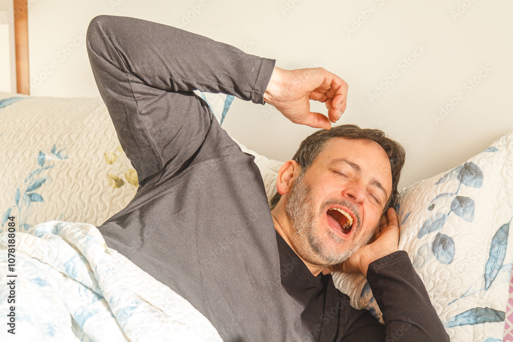 Happy middle aged man stretching in bed in the morning