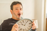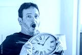 Stressed man alarm clock. Hate early morning awakening. Daily stress. Get up right now