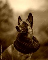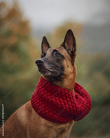 A Malinois wearing a red scarf sits calmly in an autumn forest, surrounded by warm colors. The dog's posture and the scarf create a cozy, peaceful scene amidst nature.