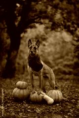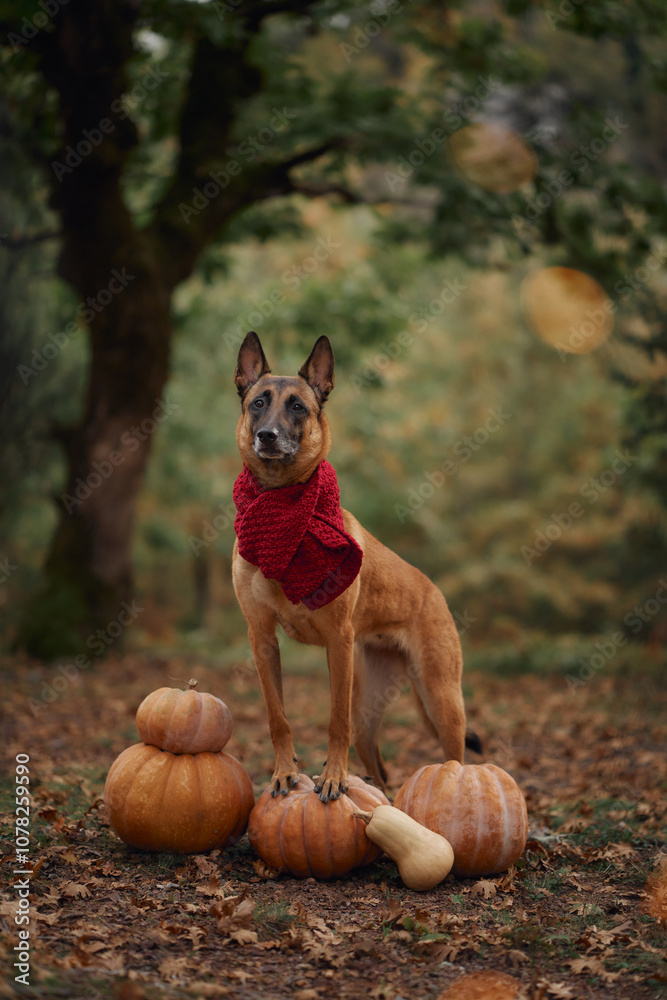 A Malinois sits beside a display of pumpkins in a forest, embodying the autumn spirit. The natural setting and the pumpkins emphasize the seasonal atmosphere.