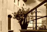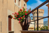 Bowl with flowers on the streets of Tossa de Mar view from the tower, Costa Brava, Catalonia, Spain