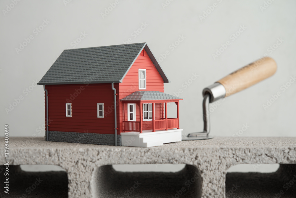 House model on steel bricklaying trowel and cement block. Construction industry, contractor, real estate development, financial planning for dream home, family built and so on concept.