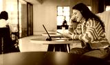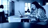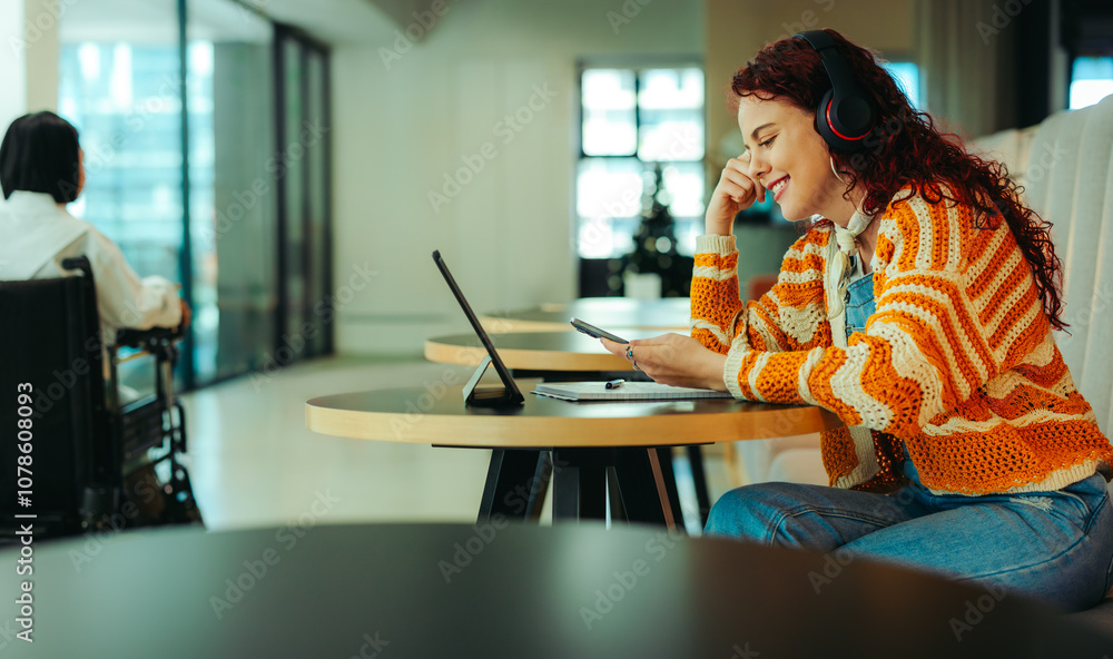 Smiling high school student text messaging on a smartphone while sitting at a table and wearing headphones