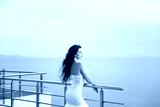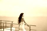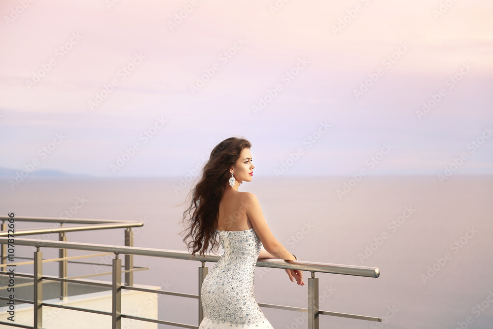 Beautiful bride girl in beaded wedding dress. Summer holiday fas