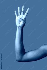 A hand making a gesture with a green background during daylight