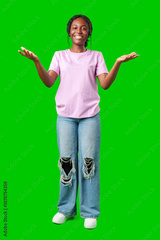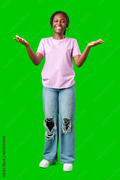 A young woman in casual attire smiles playfully with hands raised in a questioning gesture against a bright green background