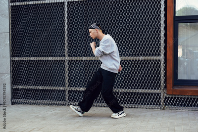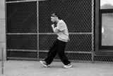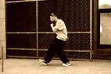 A man wearing a gray sweater and black pants dances in front of a chain-link fence in the daytime