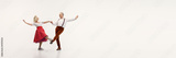 Senior couple, stylish man in suspenders and elegant woman in polka dot dress, dynamically dancing isolated on white background. Concept of retro dance, hobby, aging, active lifestyle