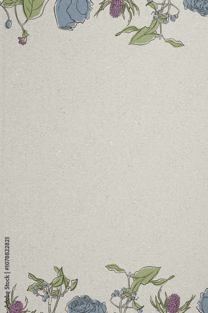 Pretty vertical angle frame with illustration of blue roses and plants on cardboard background
