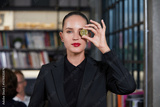 close up businesswoman holding and showing golden bitcoin cryptocurrency on hand