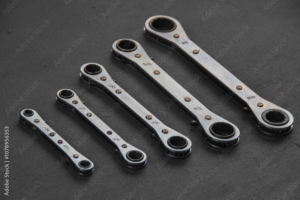 Ratchet spanner wrench set metric and imperial with double size ring isolated on gray background with dramatic low-key lighting.