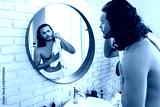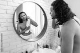 Young man grooming himself in a modern bathroom mirror with natural lighting